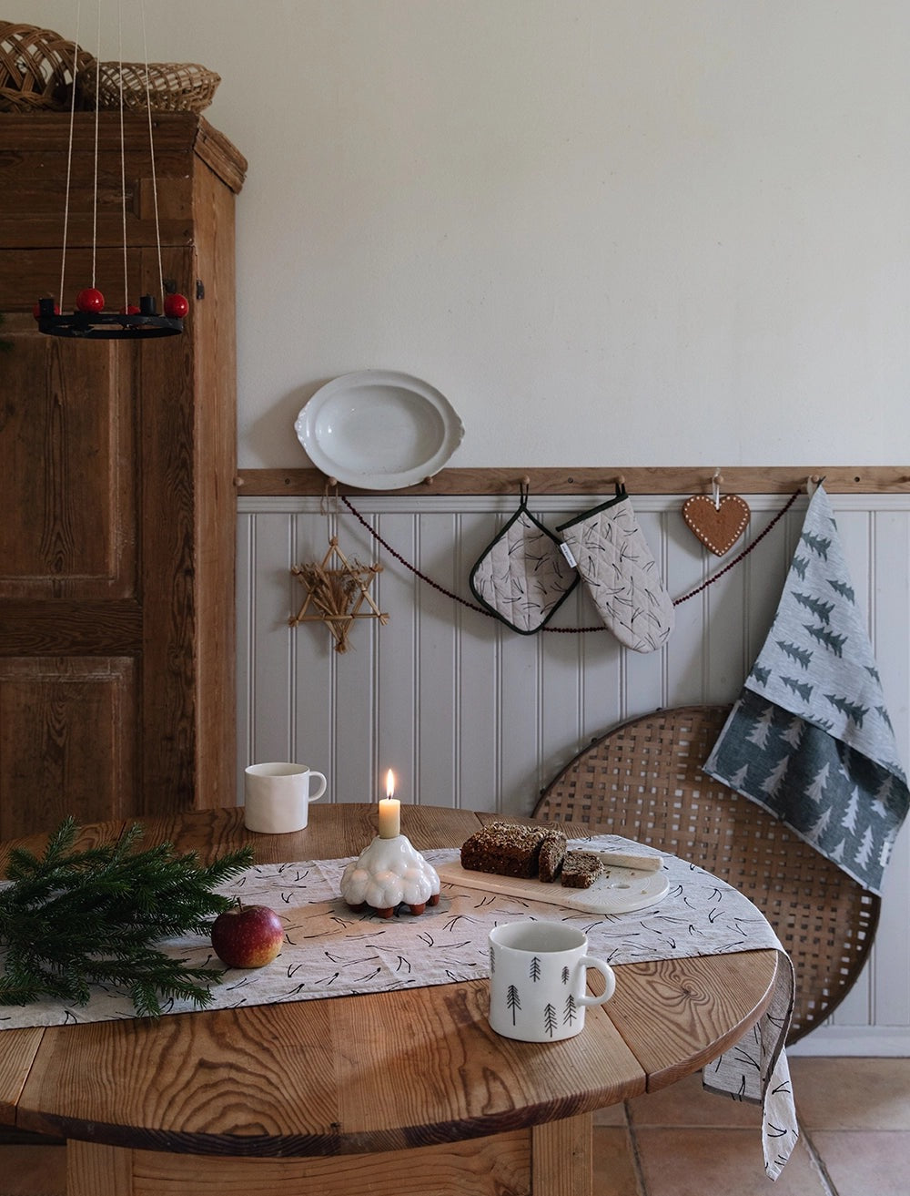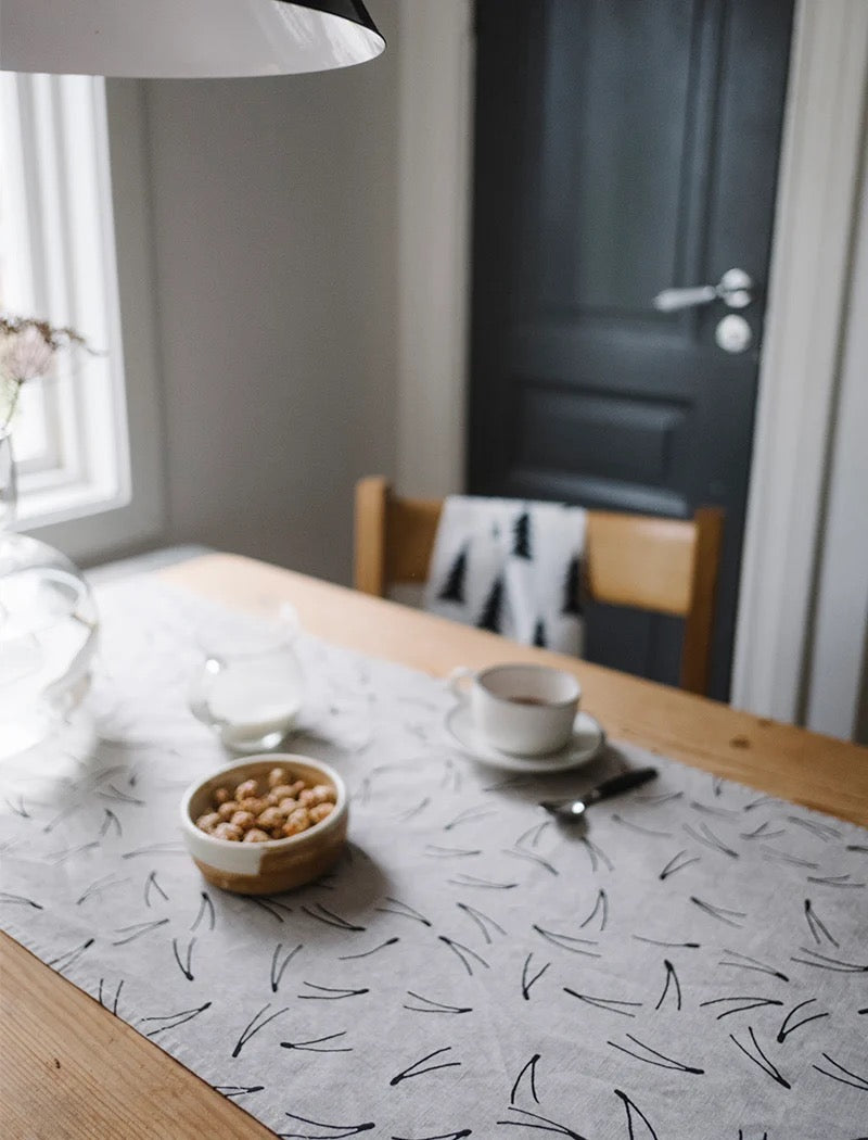 En tidlös bordslöpare i tvättad, oblekt linnekvalitet med ett grafiskt mönster inspirerat av den skandinaviska naturen. Använd den centrerad på bordet som en lugn bas för en stilren mittdekoration, eller placera den tvärs över bordet och duka direkt ovanpå. Passar lika fint ensam som tillsammans med en enfärgad linneduk, där mönstret får stå i fokus.
