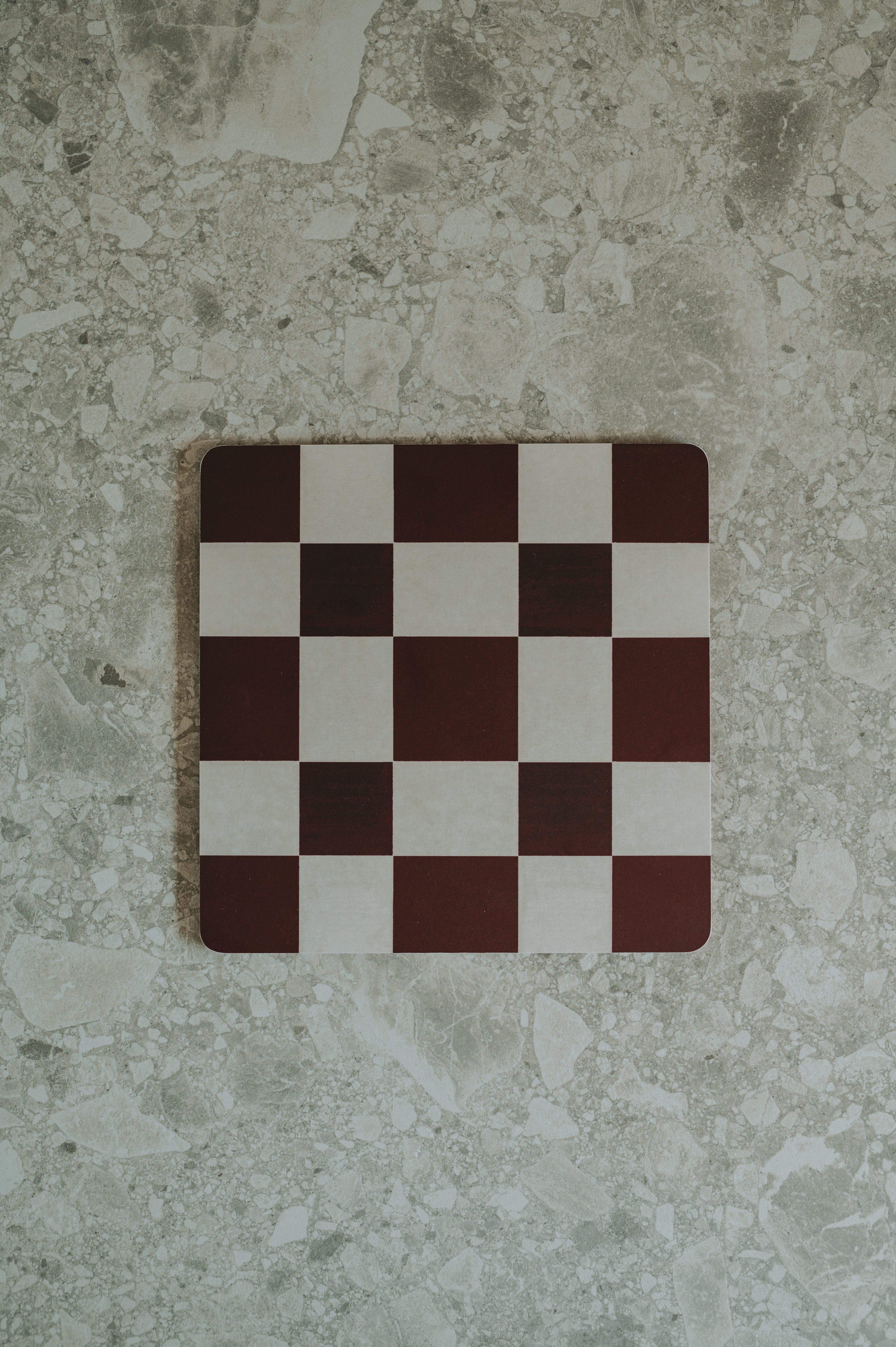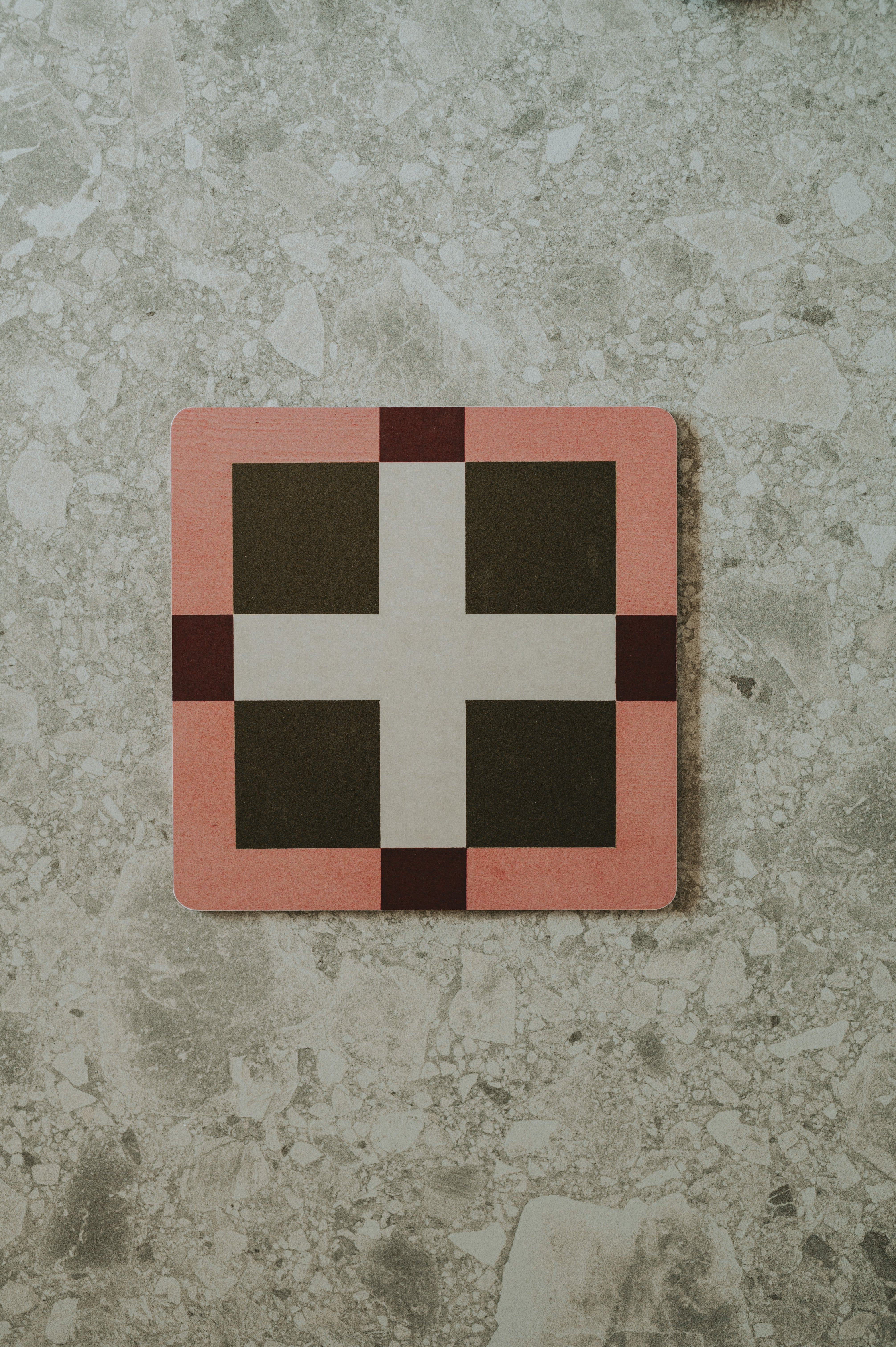 Underlägg med geometriska former i djärva färger à la Evelina Kroon. Använd det till grytan, koppen, smörgåsen – eller som en dekorativ detalj i köket.