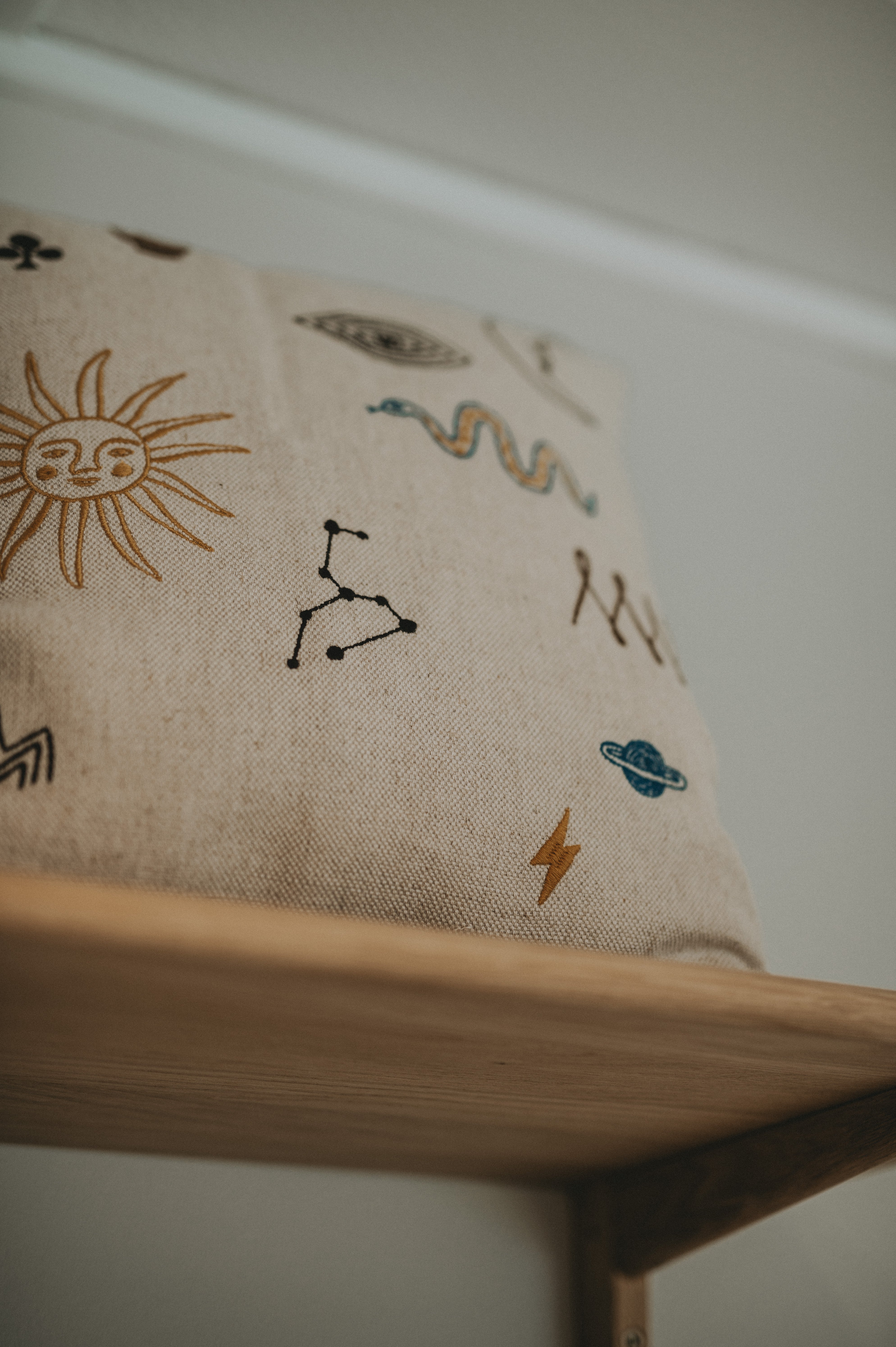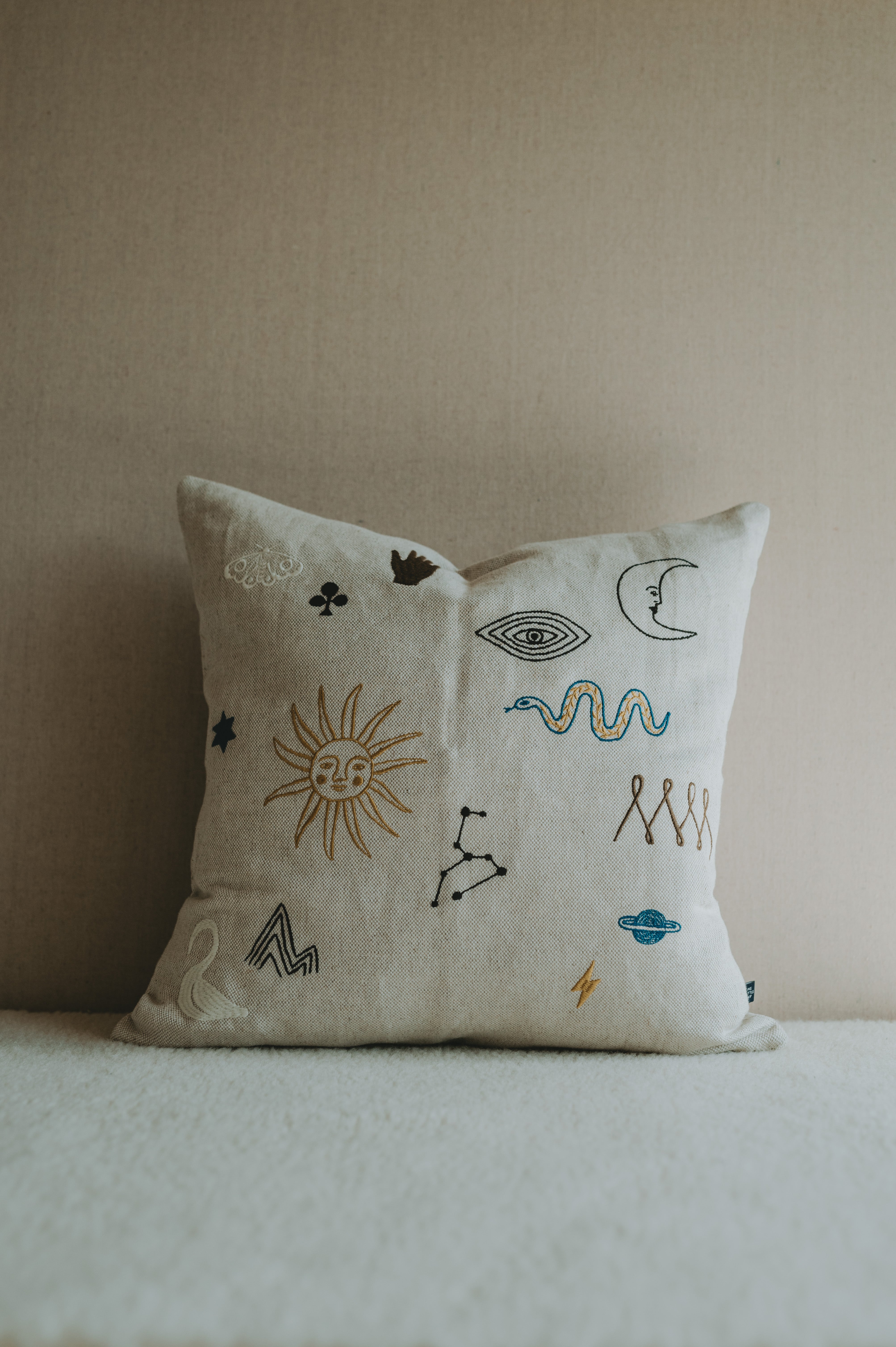 En vacker kudde som ger både stöd och stil, oavsett om den placeras i stolen, soffan eller favoritfåtöljen. Kuddfodralet är sytt i en kraftig, mjuk linnekanvas i naturfärg, med ett broderat motiv formgivet av Elisabeth Dunker. Det handgjorda uttrycket och de lekfulla detaljerna gör kudden till en konstnärlig accent i hemmet – lika fin ensam som i kombination med andra textilier.