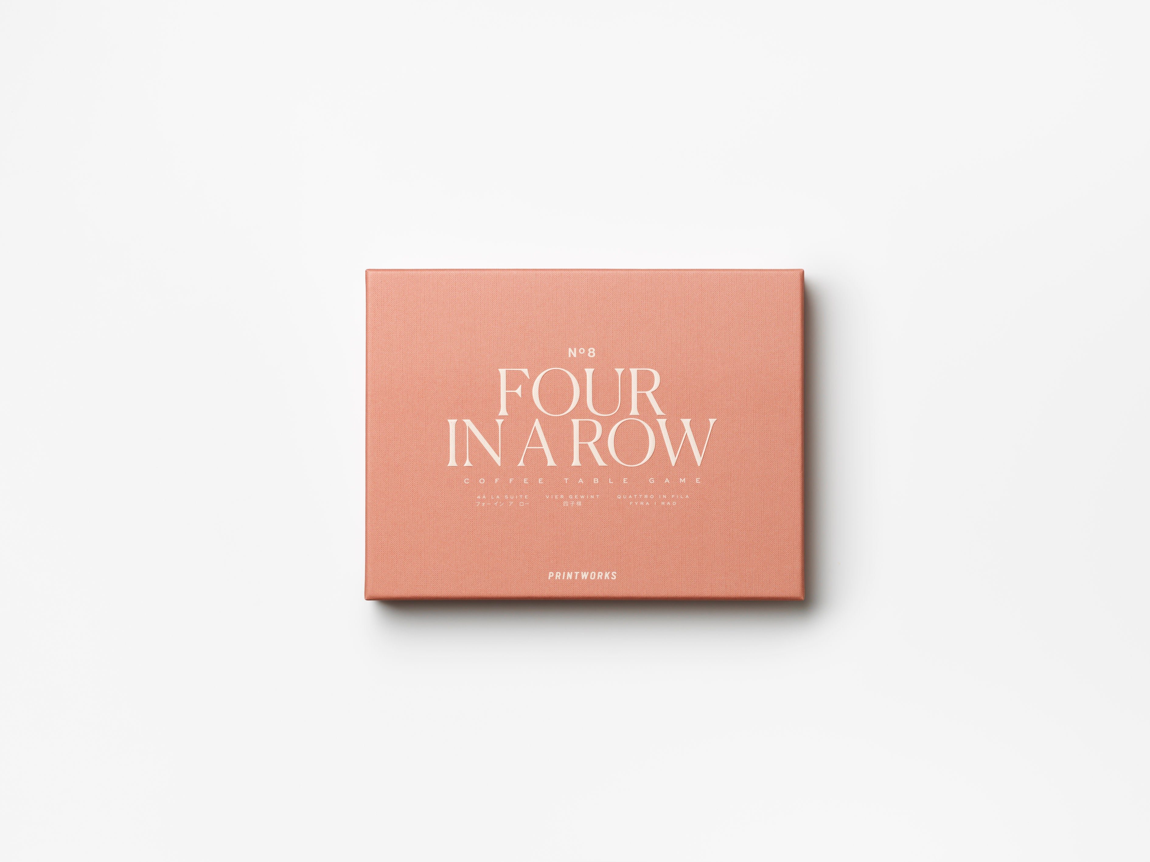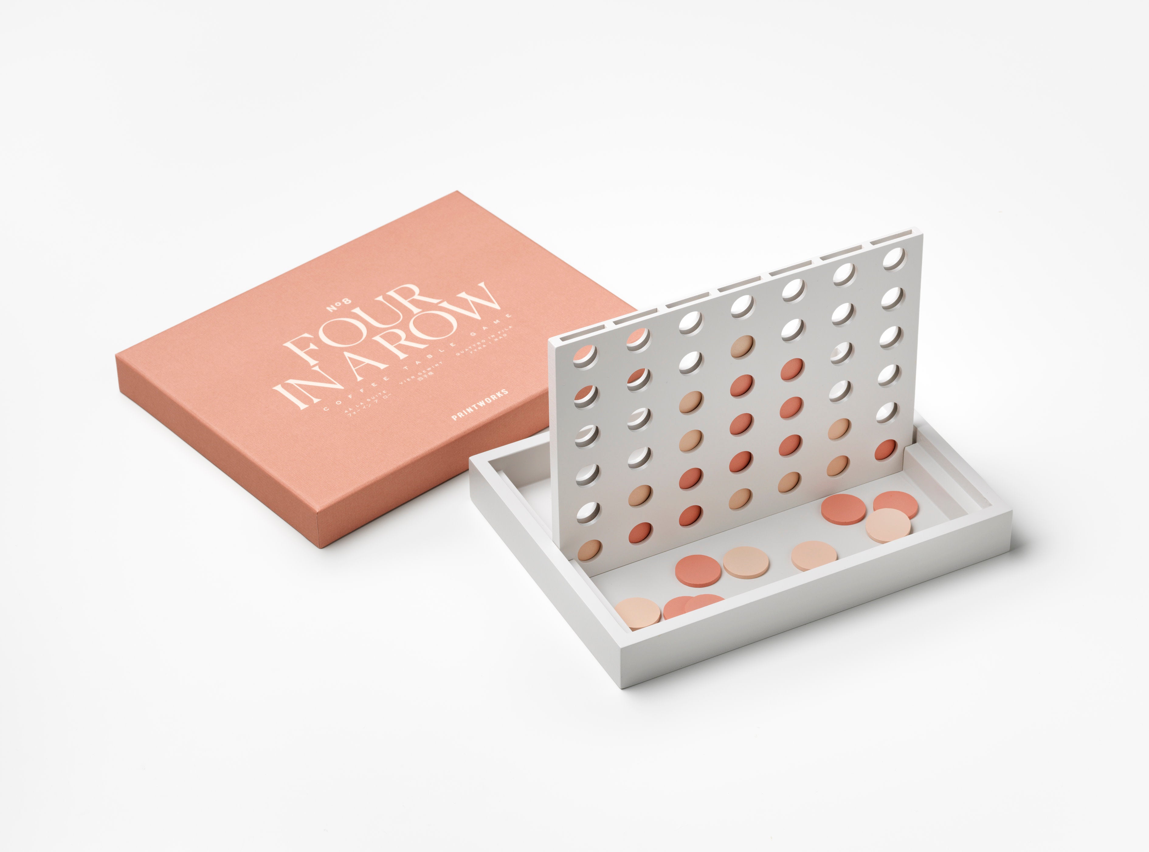 En klassiker i ny tappning. Fyra i rad har fått en ny form med en mjuk färgpalett i rosa och grått – ett spel som blir lika mycket en dekorativ detalj som underhållning för två. Tillverkat i lackat trä med 42 spelbrickor (21 av varje färg) och en smart vikbar design som gör det enkelt att förvara.