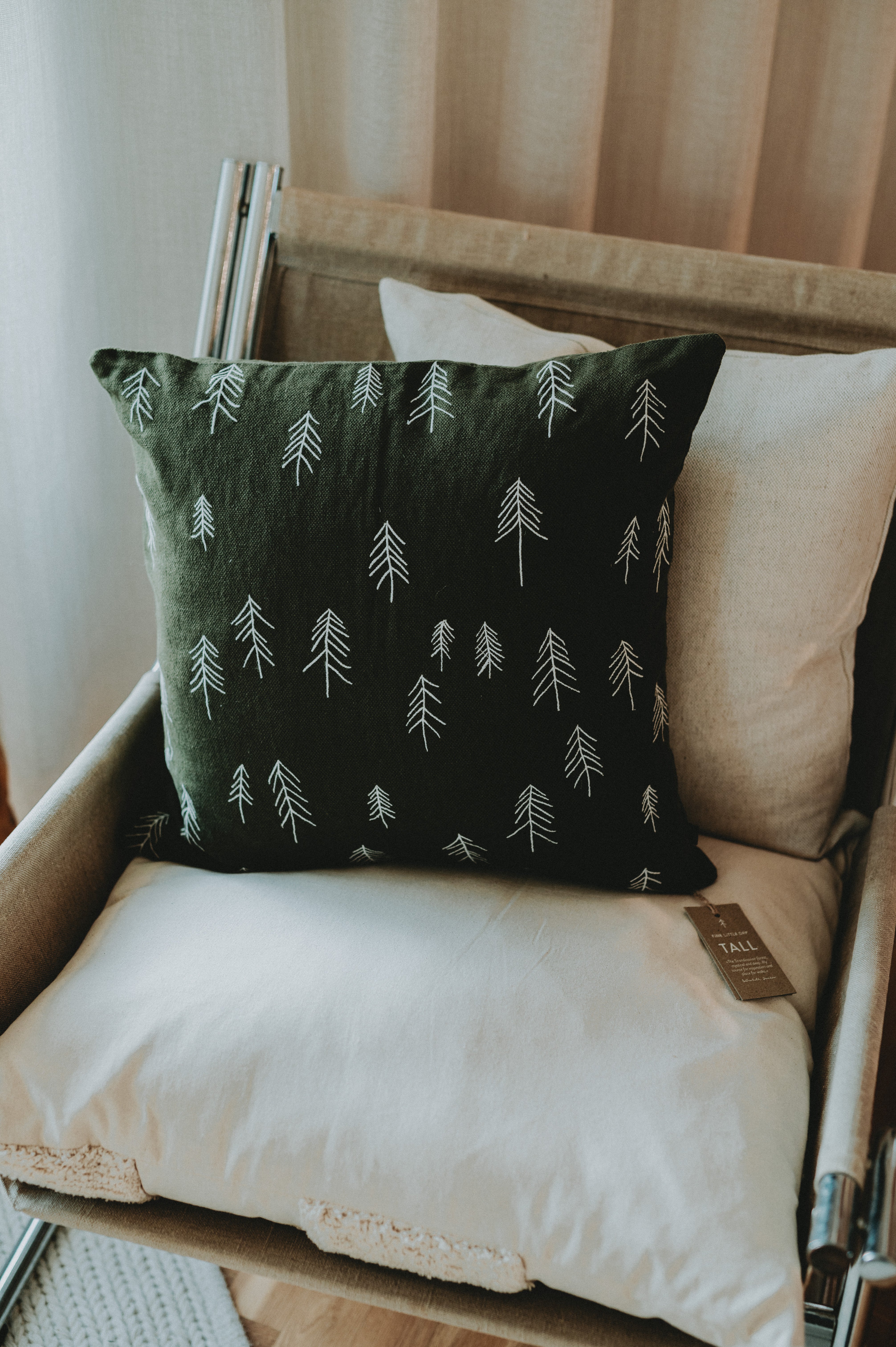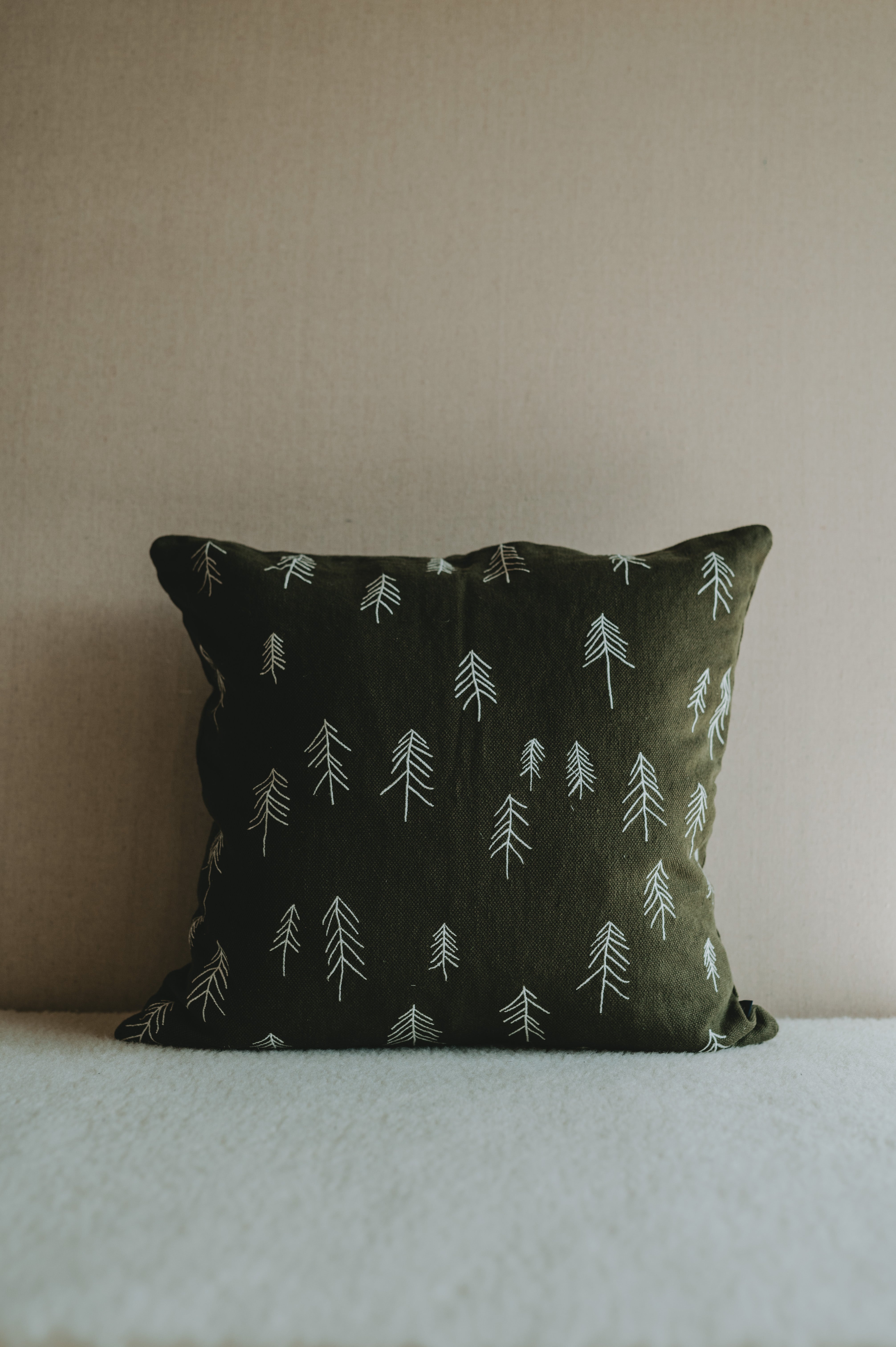 Ett mjukt och kraftigt kuddfodral i linneblandning med det broderade mönstret Tall av Elisabeth Dunker. Den gröna botten och de vita broderade tallarna för in naturens lugn och enkelhet i hemmet – en tidlös detalj som passar lika fint i soffan som i sovrummet.